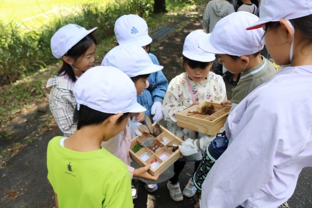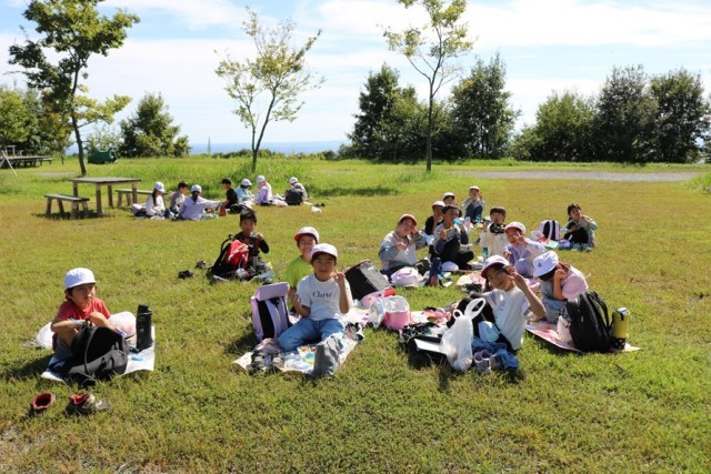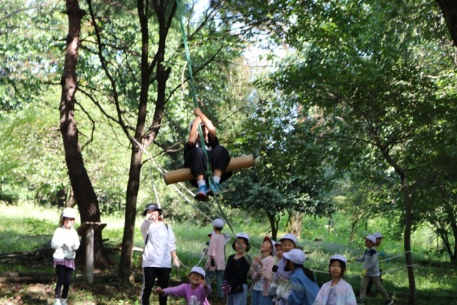 10月2日(木) 晴天のなか、2年生が校外学習に出かけてきました。赤城山南面にあるサンデンフォレスト「森の教室」で貴重な体験をしてきました。森の中に入り、木を使った遊具で楽しみました。また、ノコギリを使って竹を切ったり、木にロープを巻き付けて、一人の児童を持ち上げたりもしました。さらに、森の中でいろいろな楽しみを発見するビンゴにも挑戦しました。その後、広場に戻り、ヤギが見つめるなか、おいしいお弁当をいただきました。児童の皆さんは、いろいろな森の楽しさを実感することができたようです。