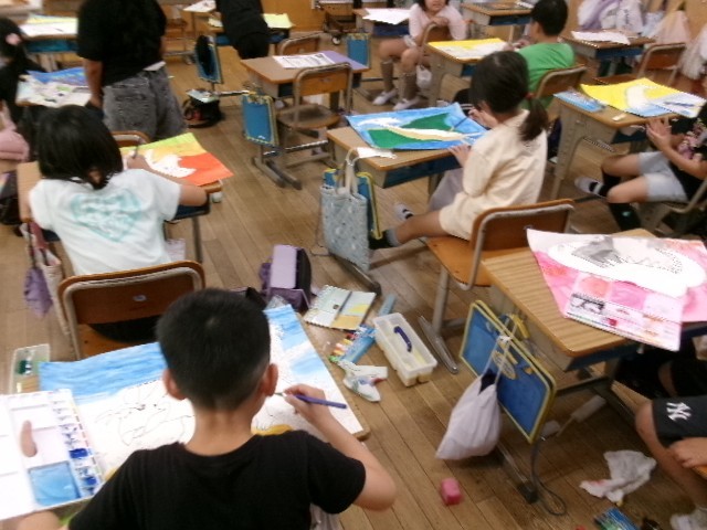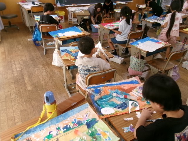 10月6日(月) 2-1と2-2は、図画工作の授業で「きょうりゅうにのって」という題名の絵をかいていました。