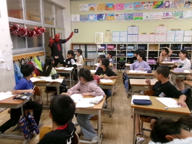 10月31日(金) ハロウィンにちなんで、ALTの先生が悪魔に扮装して、突然教室に侵入してきました。
