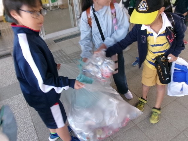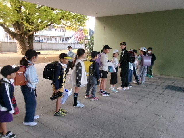 11月4日(火) 今月のアルミ缶回収が、登校時におこなわれました。あっという間に大きなビニール袋に空き缶がいっぱい入れられていきました。その後、しおりを手に入れるための長い列ができあがっていました。