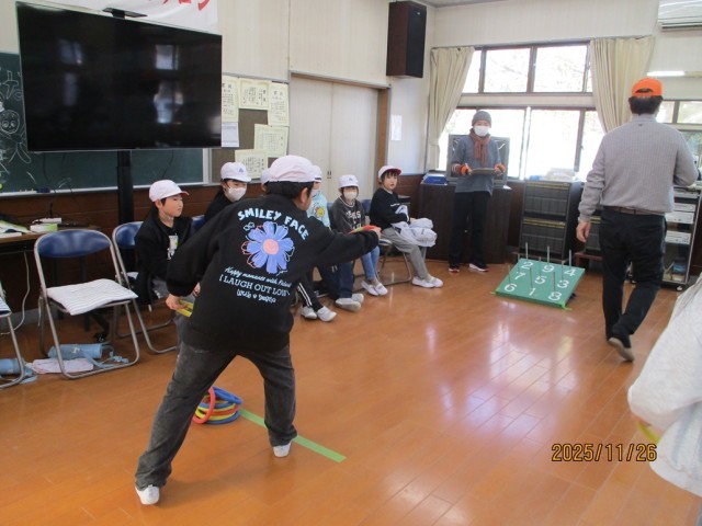 11月26日(水) 3・4校時に、4-2は校外学習として、貴先神社にある公民館におじゃまして、地域の方と交流をしました。最初に、貴先神社の成り立ちや地域のようすについて教えていただきました。その後、輪投げやスカットボールなどのレクリエーションで楽しませていただきました。