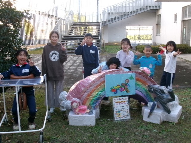 7組と10組の児童は、太田市でおこなわれた「やぶ塚かかしまつり」に出展した作品を学校に持ち帰り、中庭に展示しました。作品名は「みんなのすきなもの」です。中央の手作りの大きな虹のまわりに、児童それぞれのかわいらしい作品が飾られています。