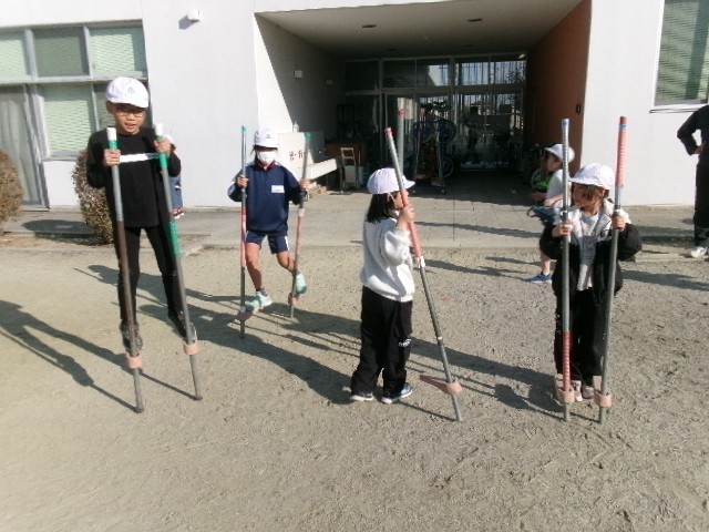 竹馬に挑戦 公開日 2025/12/11 更新日 2025/12/11 学校行事 最近、休み時間になると竹馬に挑戦する児童がみられるようになりました。高さは、児童によってさまざまですが、みんな楽しそうに取り組んでいます。