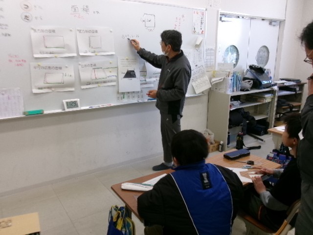 図形の求め方 公開日 2026/01/14 更新日 2026/01/14 学校行事 1月14日(水) 9組では、5年生の児童を対象に図形の面積の求め方について学んでいきました。長方形や平行四辺形、台形の面積の求め方を確認したあと、ひし形の求め方を考えていきました。とても意欲的に学習していました。