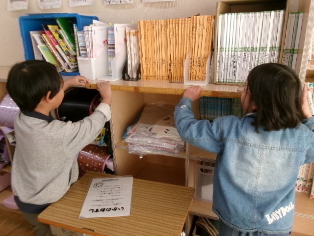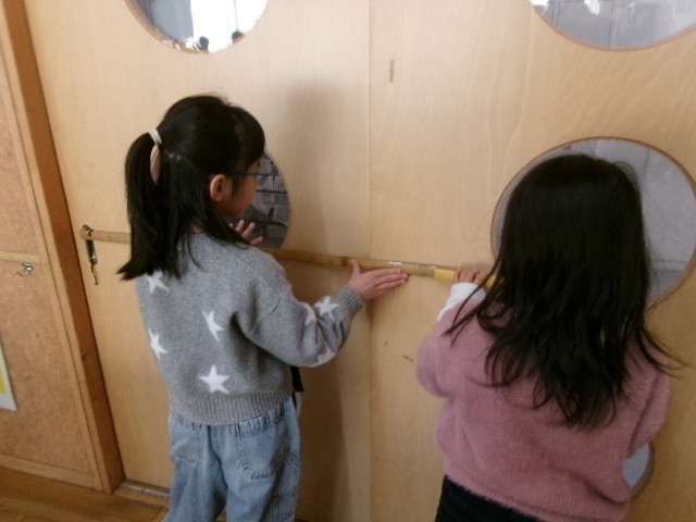 教室の戸やディスプレイ、ロッカーの長さを2人組で測っていきました。