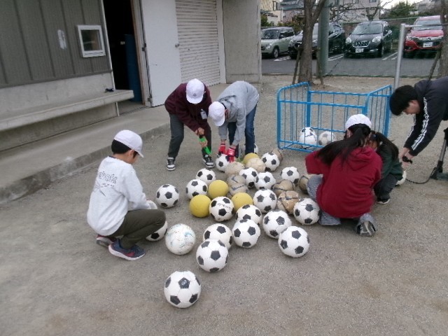 体育委員会は、サッカーボールの空気を入れるなど道具の手入れをしました。