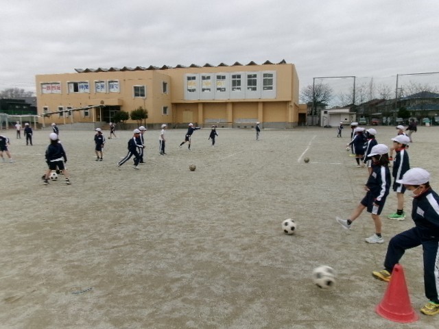 今回は、サッカーボールを使って、「蹴る・止める・足でドリブルする」などの運動をしました。