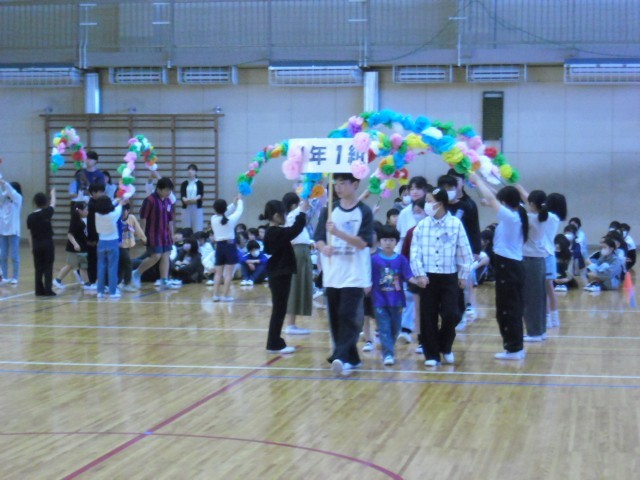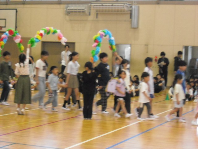 6年生が手つなぎ同伴で4年生の作る花のゲートをくぐって入場しました。