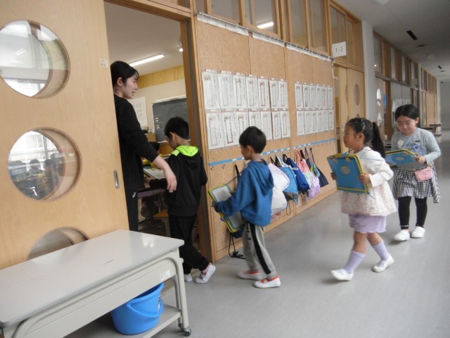 1年 学校(お部屋)探検の練習 公開日 2026/04/27 更新日 2026/04/27 1年生 明日から、1年生は学校探検(お部屋探検)が始まります。校長室や職員室など、普段は入ることのない部屋を見て回る予定です。今日は、小グループで、訪問する/入室する練習をしました。「失礼します」「学校探検に来ました」元気な声で入室のイメージを作っていました。