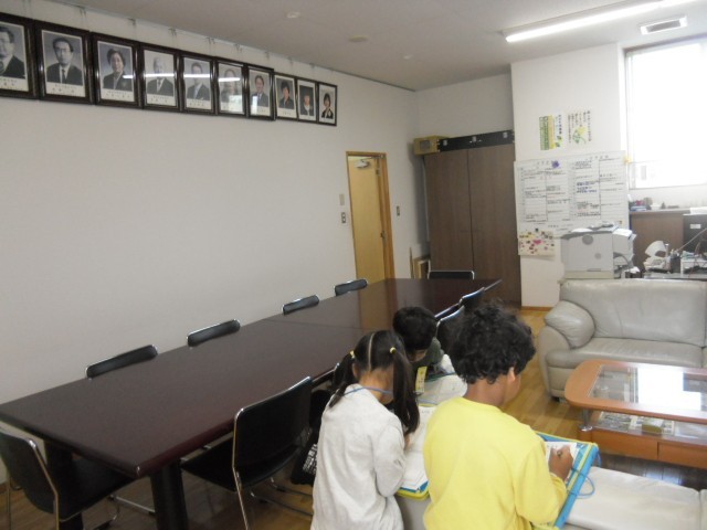 校長室では、「木崎カルタ」をみつけて描いていた子や歴代校長の肖像写真をみつけて描いていた子、棚に飾られた五重塔の置物を描いている子もいました。