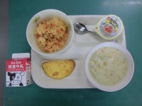 牛乳、チキンライス、オムレツ、コーンポタージュ、イチゴゼリー子ども達の大好きなメ...