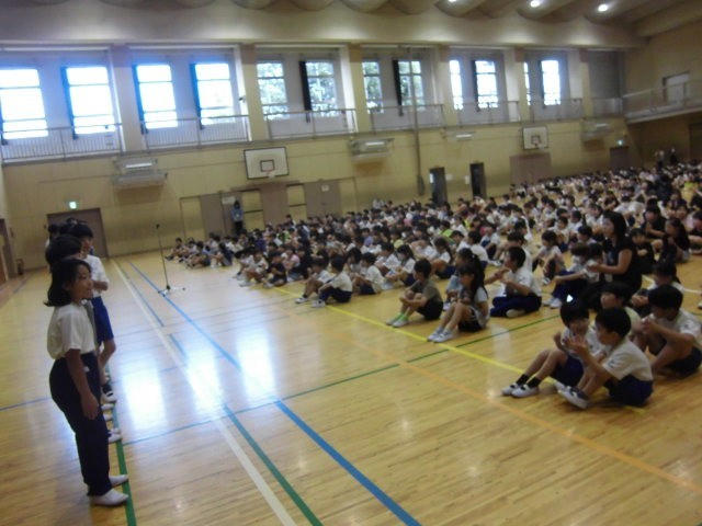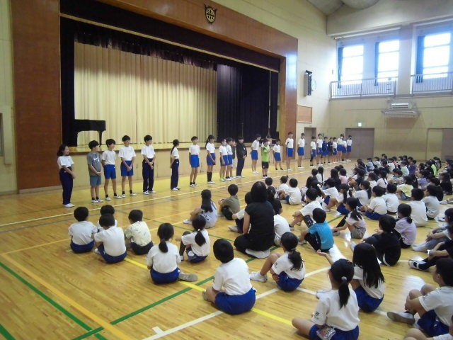 選手一人一人が、クラスと名前、出場種目やがんばりたいことを全校児童の前で発表しました。最後に、選手団代表の中村くんが、学校代表としての決意表明をして、全校の児童や先生方から大きな拍手を送られました。