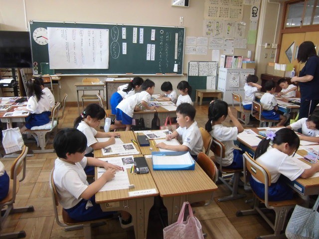 教科書にある文章を構成要素ごとに色分けしながら学んだあと、それを参考にして、新しい写真やその解説から、自分なりに説明文をつくります。