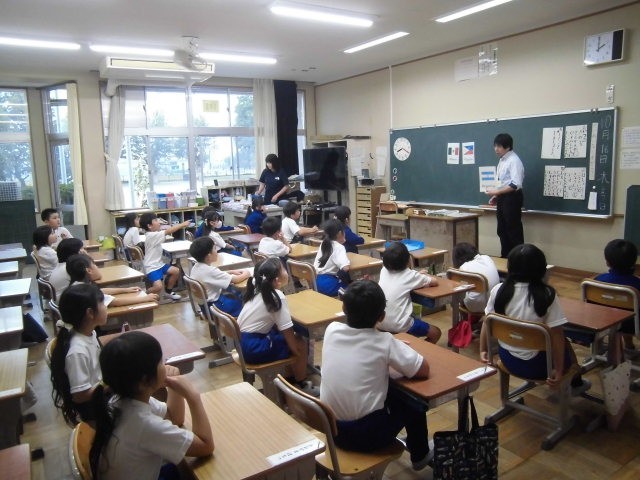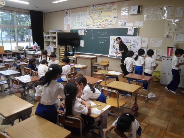 2組では、サム先生の英語の授業が行われていました。廊下まで聞こえる元気な声で、英語のあいさつをしたり、いろんな国の名前を英語(?)で答えたりしていました。