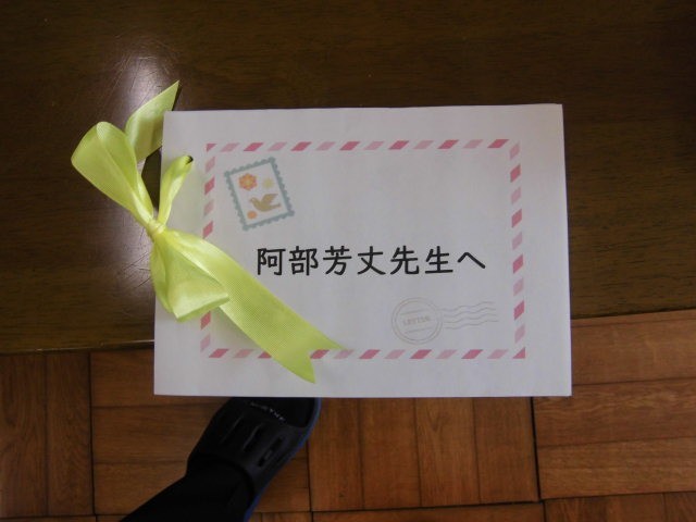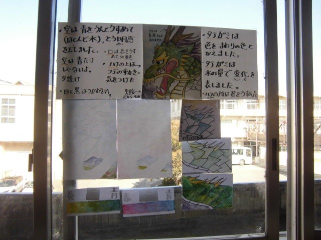 4年生の描画指導をしてくださった阿部先生が、子ども達の完成した絵を見に来ました。指導の様子は、窓に貼って残されています。子ども達から感謝の手紙に、阿部先生もとてもうれしそうでした。