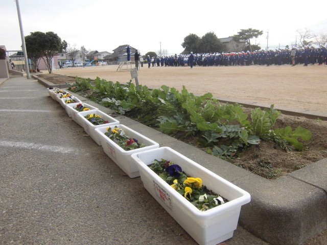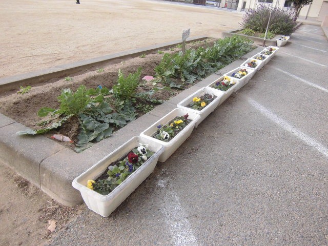 南校舎前の花だんやプランターに、花や野菜が植えられました。色鮮やかなパンジーが花を少しずつ増やし、大根は立派な葉が大きくなってきました。