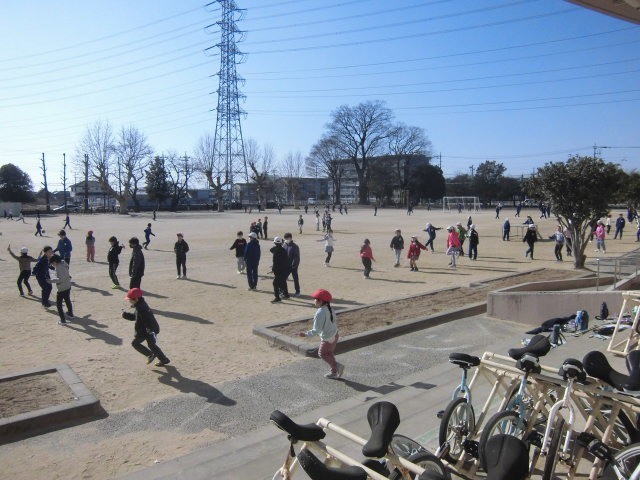 検査が終わったあとは、風が吹き砂が舞う中でも、子ども達は校庭に出てなわとびなどをして元気にリフレッシュしていました。