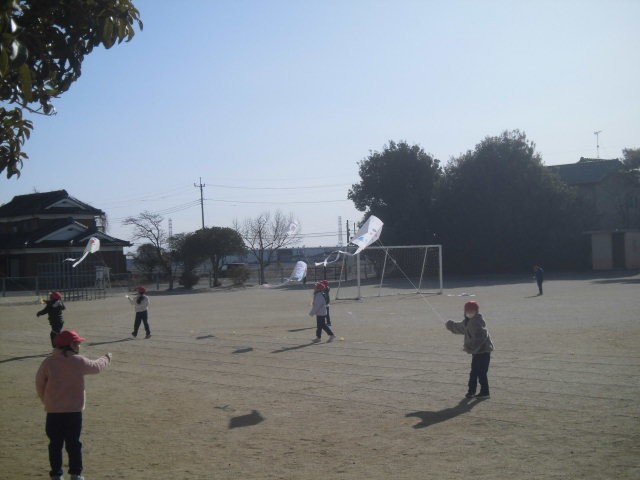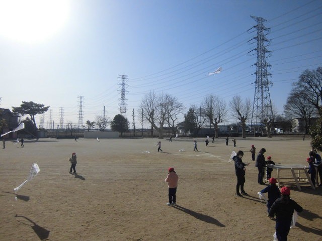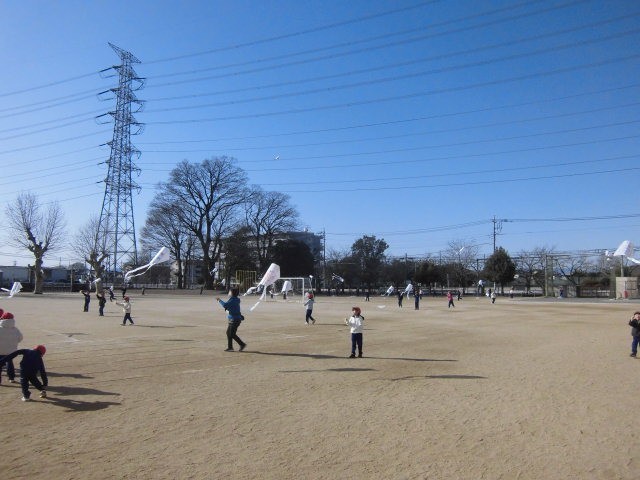 1年生のたこあげには、とてもちょうどいい天気になりました。少し寒いですが、元気に走り回りながら、10m以上も高く上げられる子もいて、とても楽しそうでした。