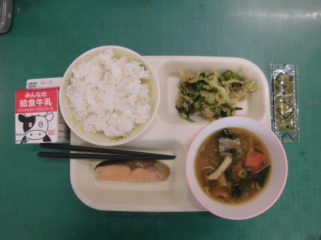 今日は、牛乳、ご飯、味付けのり、鮭の塩焼き、小松菜とツナのごま和え、すいとん です。