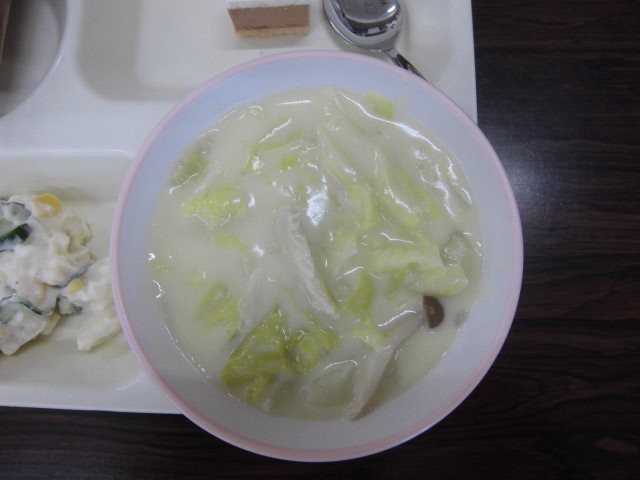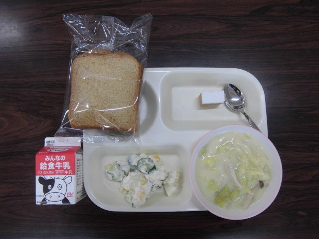 今日の給食メニューは、牛乳、黒食パン、太田のキャベツのクリーム煮、ポテトサラダ、一口ショコラバナナです。