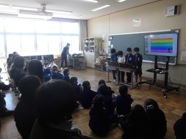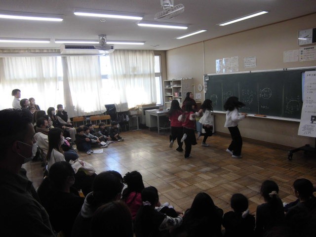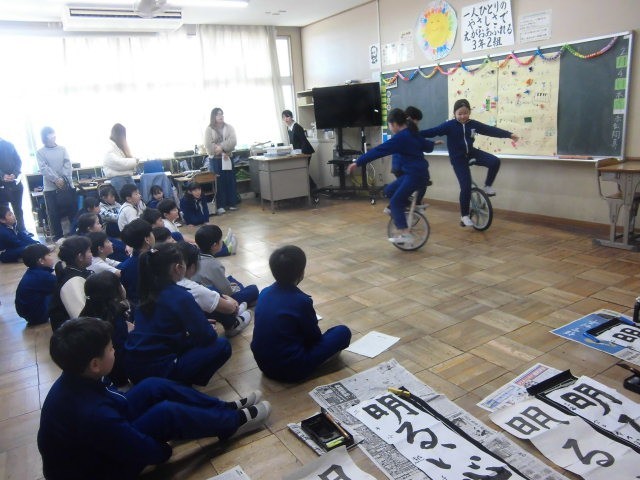 3年生は、各クラスで学習成果発表会を行いました。今年できるようになったことや調べたことの発表ですが、グループで練習したダンスや一輪車でメリーゴーランド。マット運動や習字など、ありとあらゆる得意技を披露することができました。