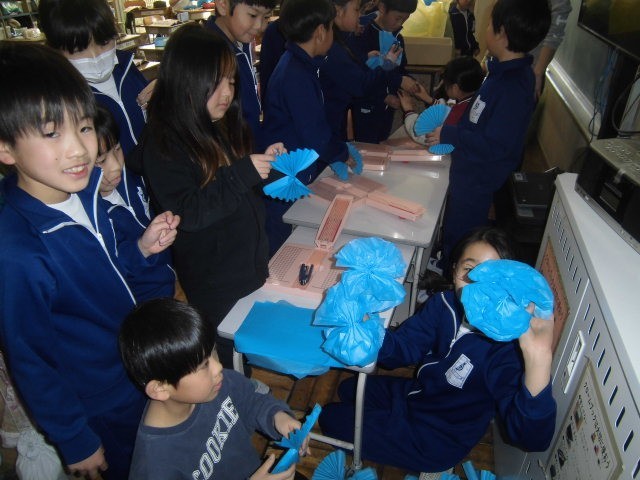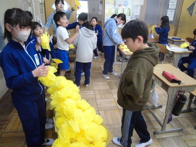 3年生が、6年生を送る会の飾り付け用の色紙で花を作っていました。薄い紙を破かないように丁寧につまんで花の形にします。ふわふわした花がたくさん出来上がりました。上手ですね!