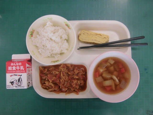 牛乳、ごはん、トマ味噌カレー豚丼、厚焼き玉子、のっぺじる
