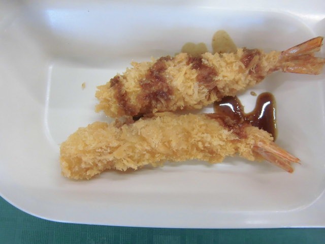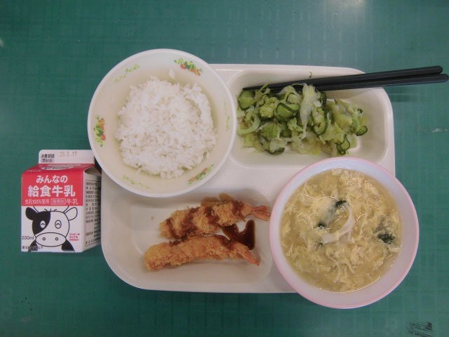 牛乳、ごはん(中学校は赤飯)、エビフライ、ブロッコリーとキャベツのサラダ、お祝いスープ