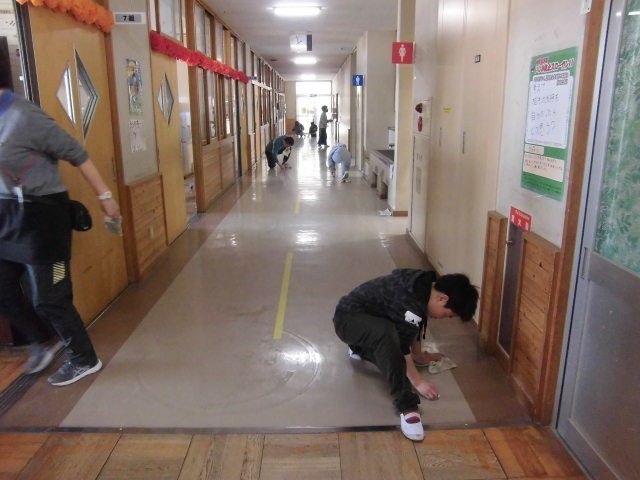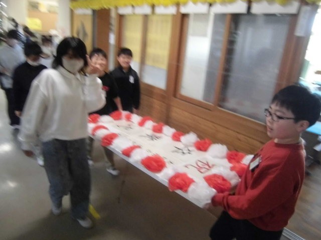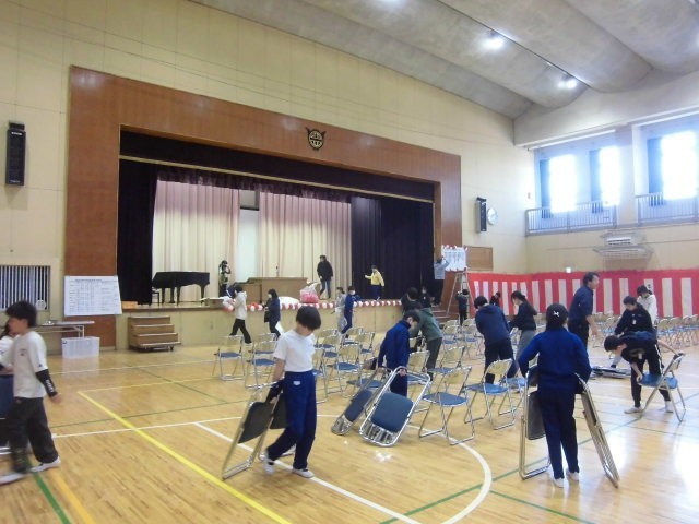 給食後、他学年が下校すると、5年生が卒業式の会場準備をしてくれました。国旗や校旗を掲げたり、紅白幕を張ったり、椅子や花を並べたり、てきぱきと作業は進みます。廊下や控室の掃除も入念にしてくれました。大変な作業でも楽しそうにやってくれる5年生は、とても頼もしいですね。
