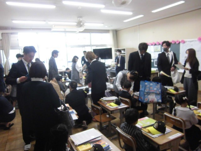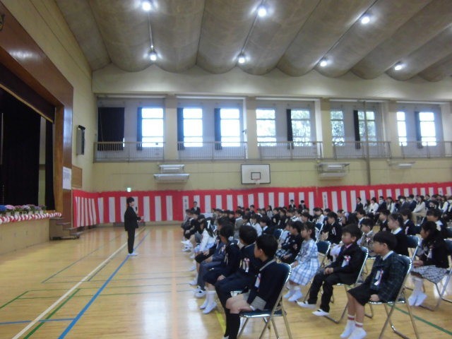 雨の心配もありましたが、誰一人欠席することなく、無事入学式を行うことができました。初めてのお子さんが通うことになる保護者の方も、少し戸惑いながら子供たちと荷物を整理して、体育館へ向かっていただきました。6年生代表の南方さんから歓迎のメッセージを受けたり、たくさんのお祝いの言葉をいただき、最後まで頑張って式に参加できました。記念写真も雨に降られず、まぶしくもなく撮影ができてよかったです。