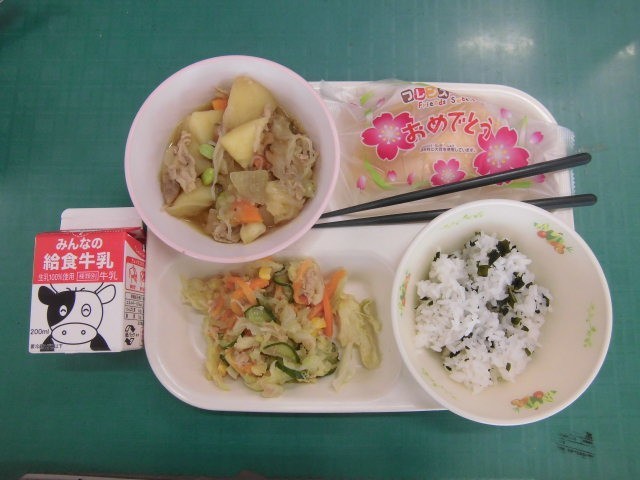 1年生の給食が始まります。記念すべき初日は、牛乳、わかめご飯、肉じゃが、ツナサラダ、お祝いクレープ(イチゴ味)です。