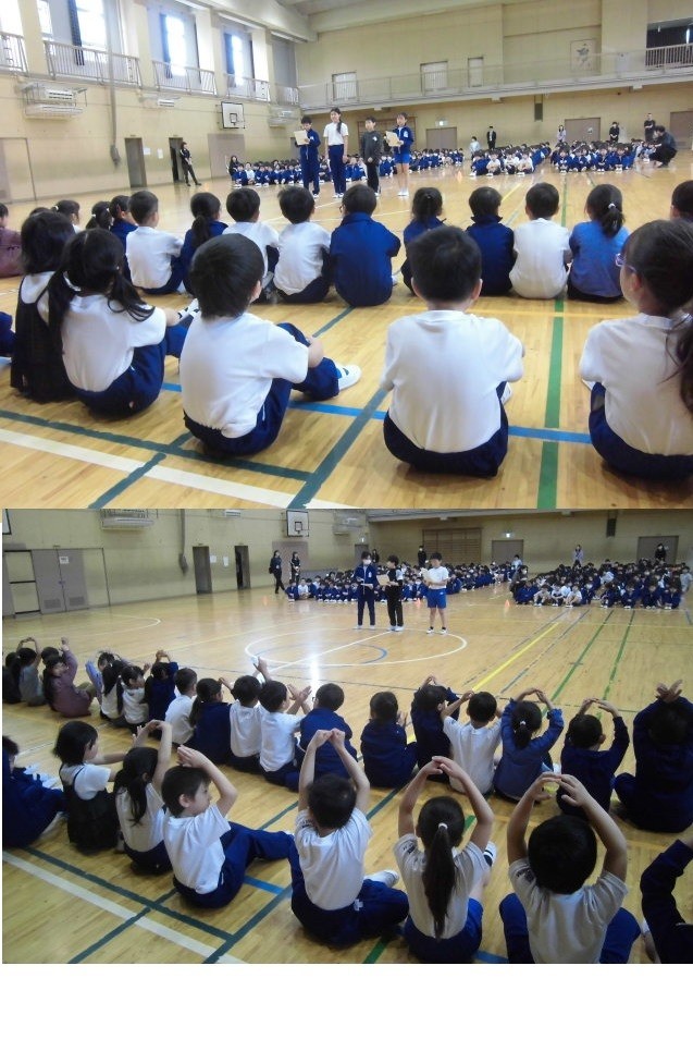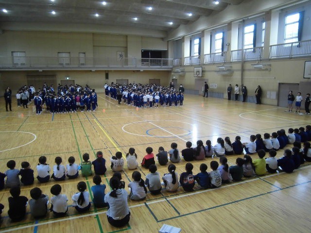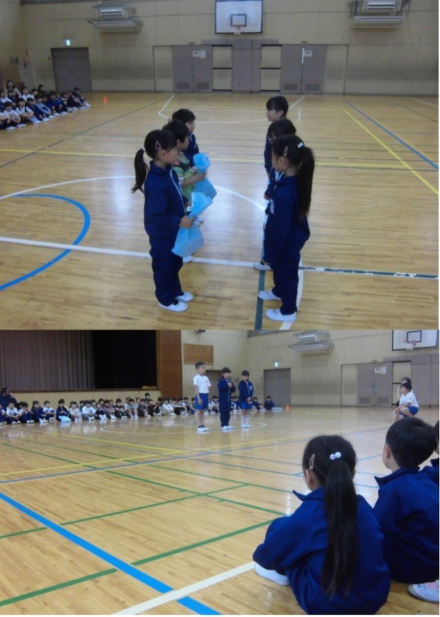 6年生と手をつないで照れくさそうに入場する1年生を全校で温かく迎え、校歌を披露したり、生品小クイズを出したり、2年生からプレゼントを渡したりしました。1年生代表の3人もしっかりお礼のあいさつができました。