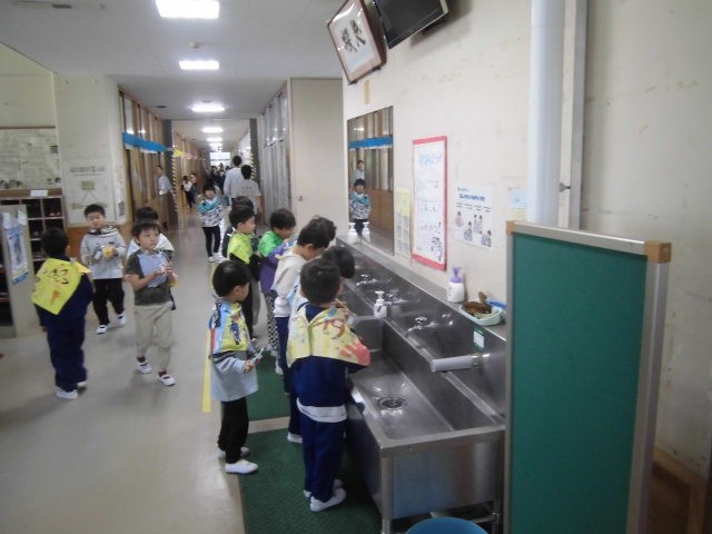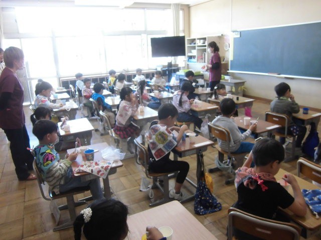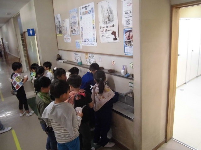 4・5・6年生が歯科検診を行っている間、1・2・3年生は、歯科衛生士さんたちのご協力を得て、ブラッシング指導を行いました。口の中を赤く染めて、きちんと磨けているかを自分で確かめます。1年生も、「染色薬がまずい。」と言いながら、丁寧に磨く練習ができました。最後に水道の水で口をすすいで、さっぱりした笑顔になりました。これからは毎日できるといいね。