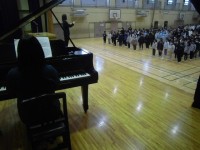 1年生は、全部の机などを出して、床をピカピカにしたところで帰りの会です。