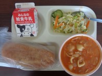 【十五夜メニュー】 ご飯・牛乳・さばの照り焼き・もやしと小松菜の和え物・里芋汁・...