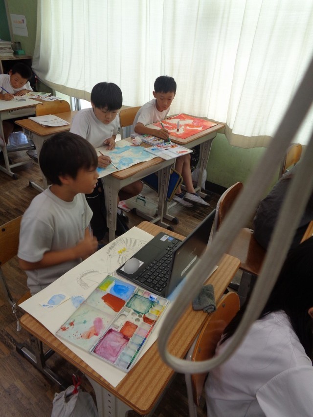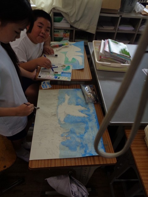 5年生が図工の時間に、国語で学習した「太蔵じいさんとガン」の水彩画を描いています。