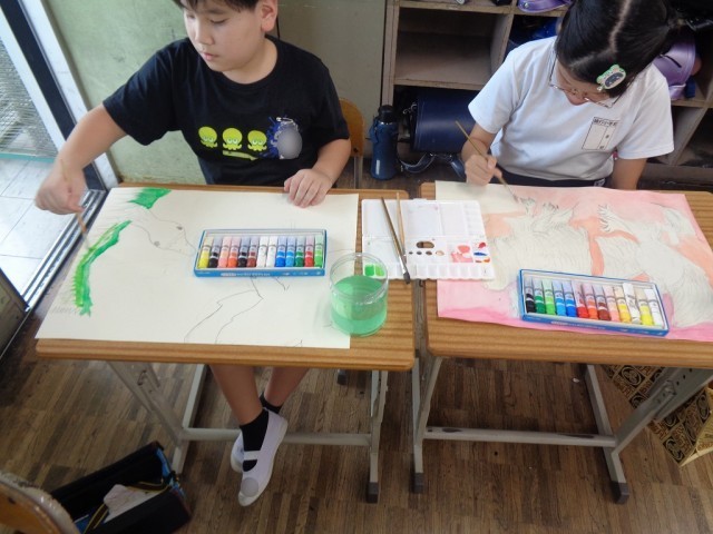 子どもたち一人ひとりが物語をイメージして、思い思いの絵を描いています。