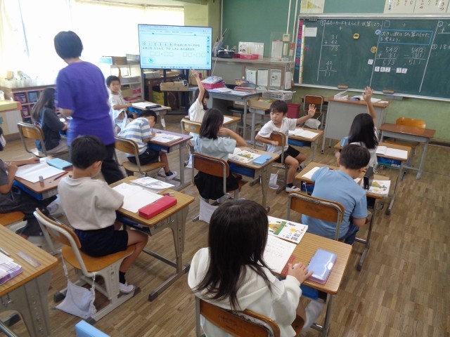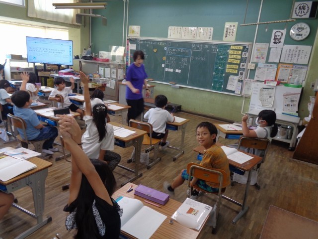 2年生の算数の授業では、足し算や引き算の筆算の仕方を学習しています。今日も先生が出す問題を一生懸命に解く姿が見られました。今では解くスピードもだいぶ速くなってきて、出される問題に筆算を使って楽しみながら計算ができています。