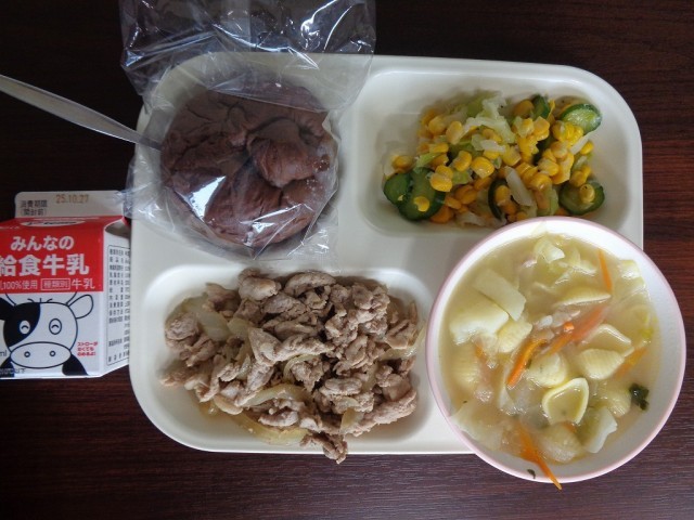 ココアパン・牛乳・豚肉の欧風煮込み・コーンサラダ・マカロニスープ