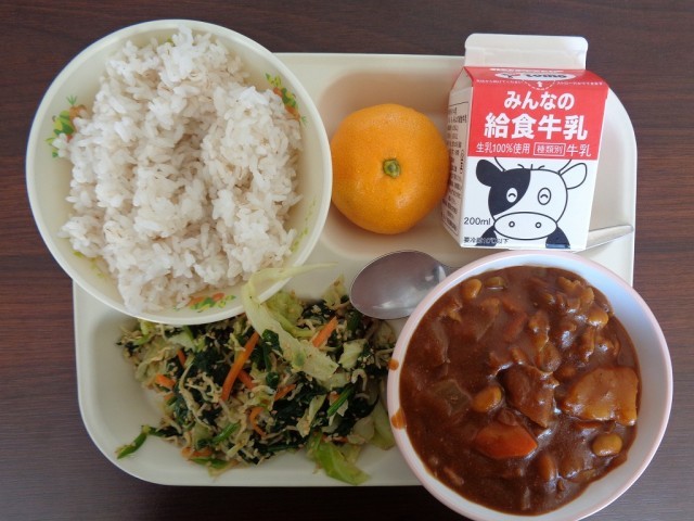 麦ご飯・牛乳・ビーンズカレー・じゃこと野菜の和え物・みかん