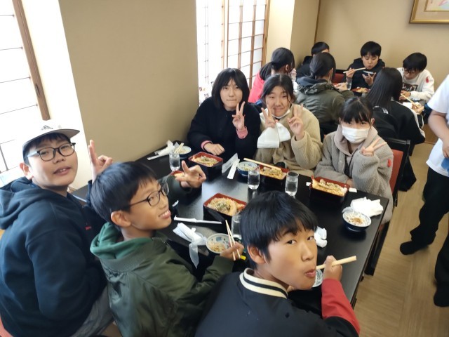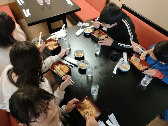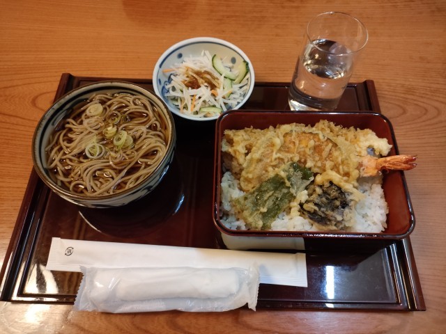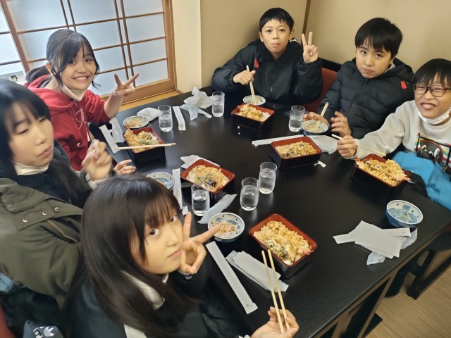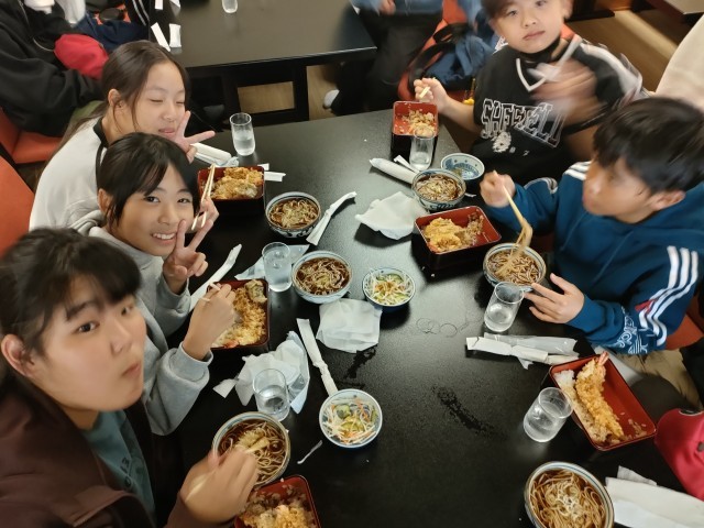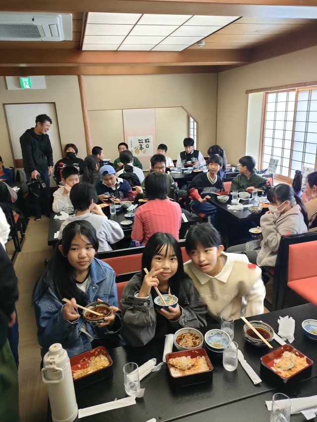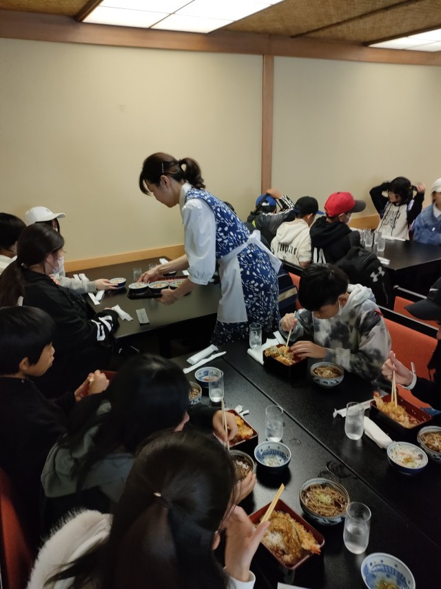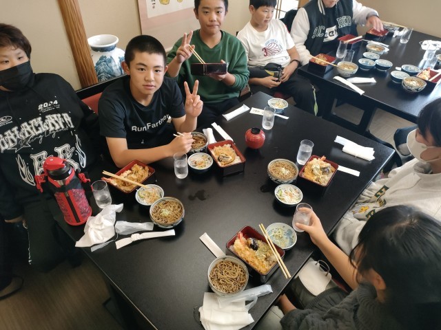 お昼ご飯はそば処峰本さんで美味しい天丼とおそばのセットで、子どもたちも大満足です。