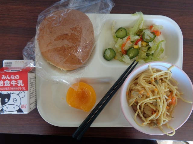 バンズパン・牛乳・海の幸のクリームスパゲティ・カラフルサラダ・ハーフピーチ
