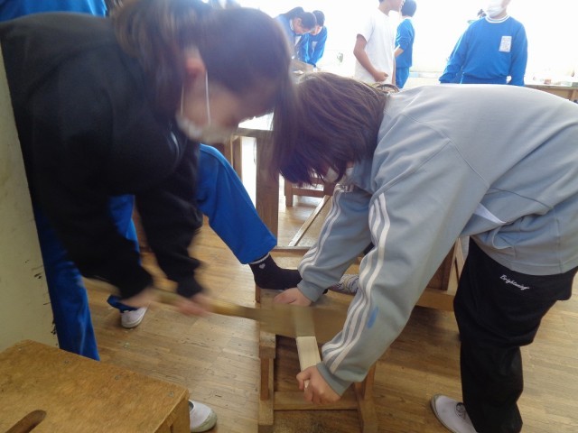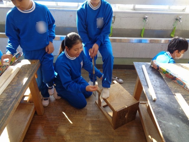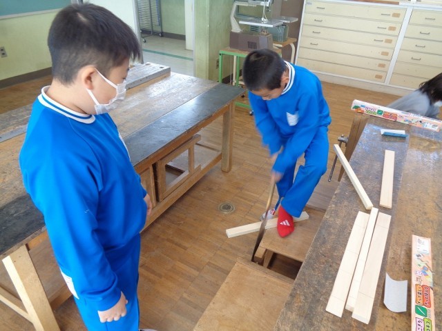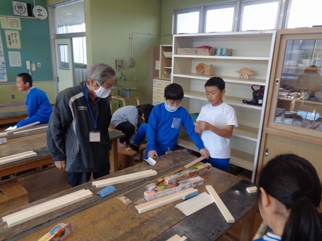 4年生の図工で、のこぎりの使い方を学習しています。今日は、地域ボランティアの方が来てくれて、のこぎりの使い方を手伝ってくださいました。本当にありがとうございました。