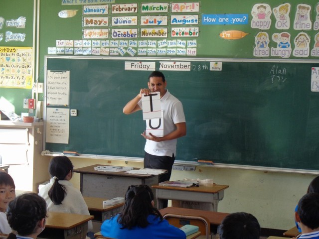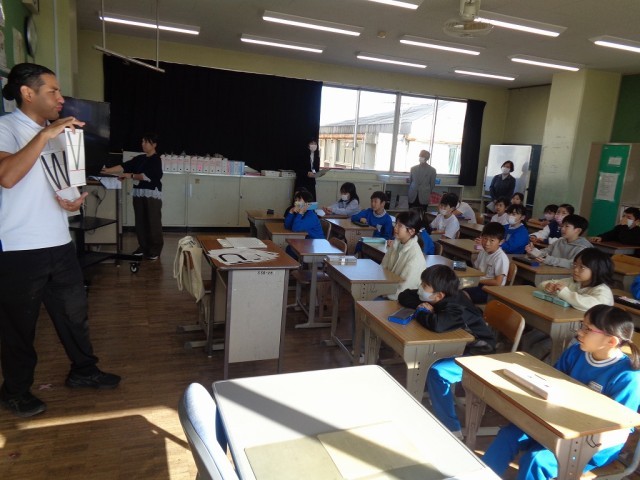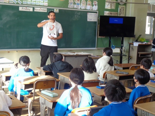 本校のALTの先生が母国へ帰国する関係で、今日から12月8日までの期間、アラン先生が来てくれることになりました。アメリカ出身のアラン先生はとてもかっこよくて、子どもたちともすぐに仲良くなりました。短期間ですが、よろしくお願いします。