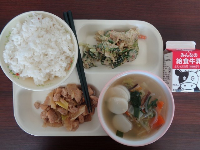 ご飯・牛乳・中華風焼き鳥煮・野菜のごまマヨネーズ和え・トックのスープ