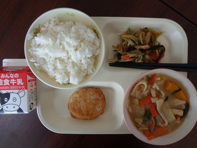 ご飯・牛乳・豆腐ハンバーグのおろしソースかけ・小松菜の煮びたし・ほうとう汁