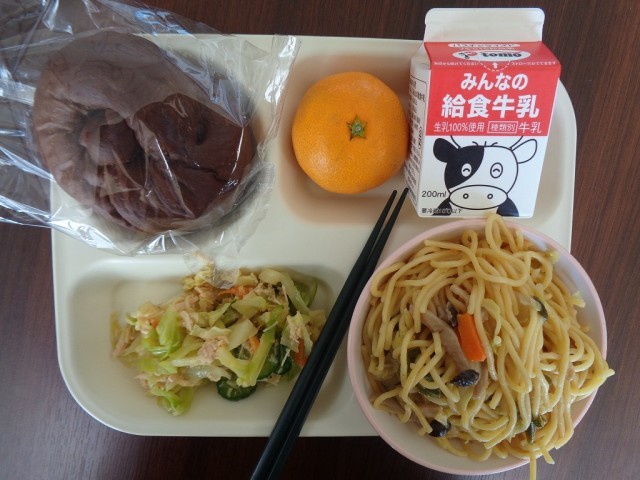 ココアパン・牛乳・八百屋スパゲティ・チキンサラダ・みかん