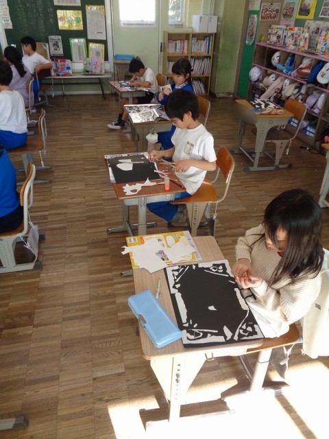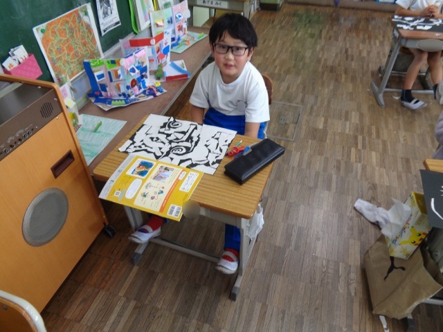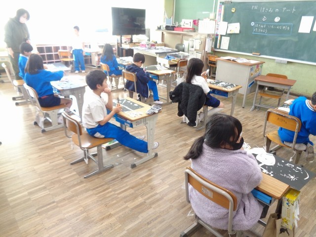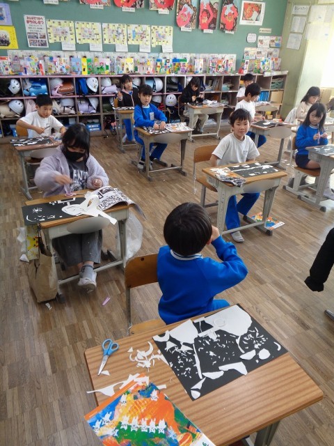 2年生の図工では、はさみを使って思いのままに紙を切って、切った紙をならべてアート作品をつくっています。子どもたちは、切った紙をいろいろなものに見立てて、自分の作品をつくりあげようとしています。