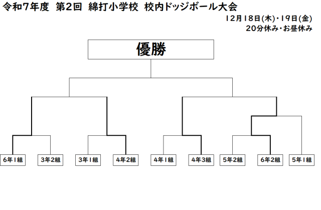 12/18(木) 第2回校内ドッジボール大会① 公開日 2025/12/18 更新日 2025/12/18 学校ブログ 今日と明日の2日間で、第2回校内ドッジボール大会が開催されます。今回のドッジボール大会は、1発勝負のトーナメント戦となっています。初戦から白熱した試合ばかりで、ステージにいる人たちからは自然に応援の声があがります。トーナメント表と本日の結果は以下の通りです。優勝はどのクラスになるのでしょうか!? +7
