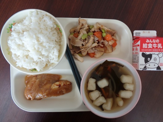 ご飯・牛乳・はんぺんのすまし汁・さばの味噌だれかけ・大根と豚肉の煮物
